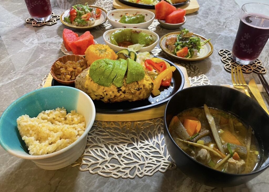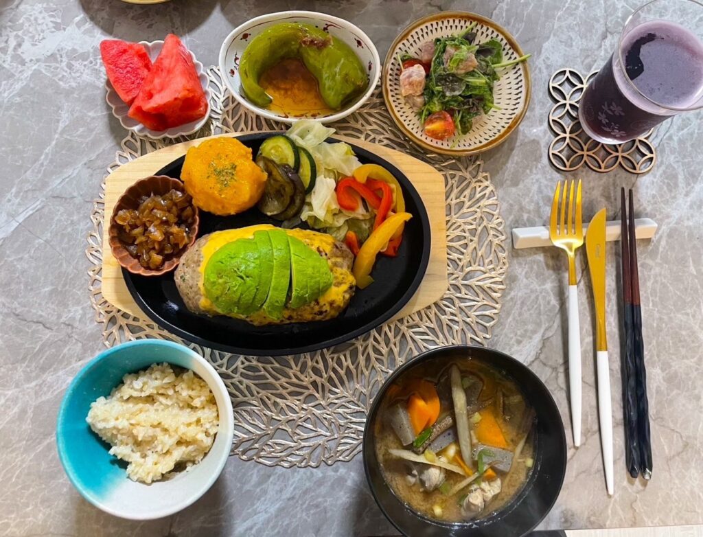 今回の献立は、肉の旨味を堪能できるメインのハンバーグを中心に、副菜や汁物で野菜をたっぷり取り入れたバランスの良い夕食になりました。