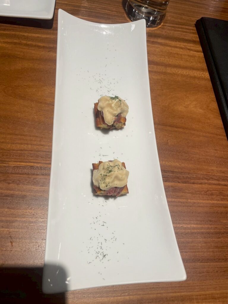 熱々のチュロスに馬肉とチーズクリームをサンドした、遊び心あふれる一皿です。