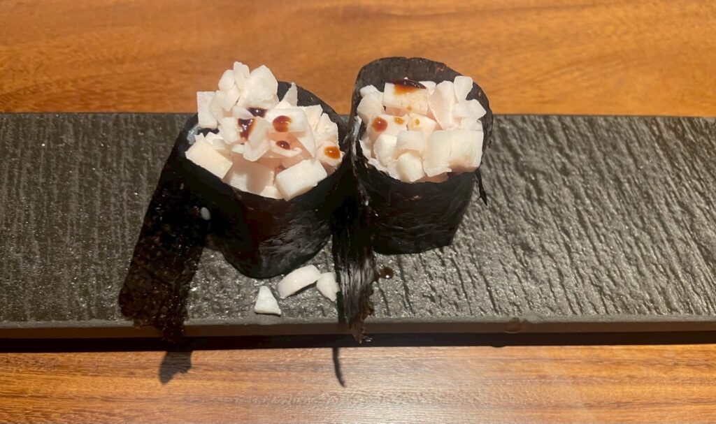 薄く巻かれた状態で提供され、手元で解けていく様子を楽しみながら食べられるのが新鮮です。