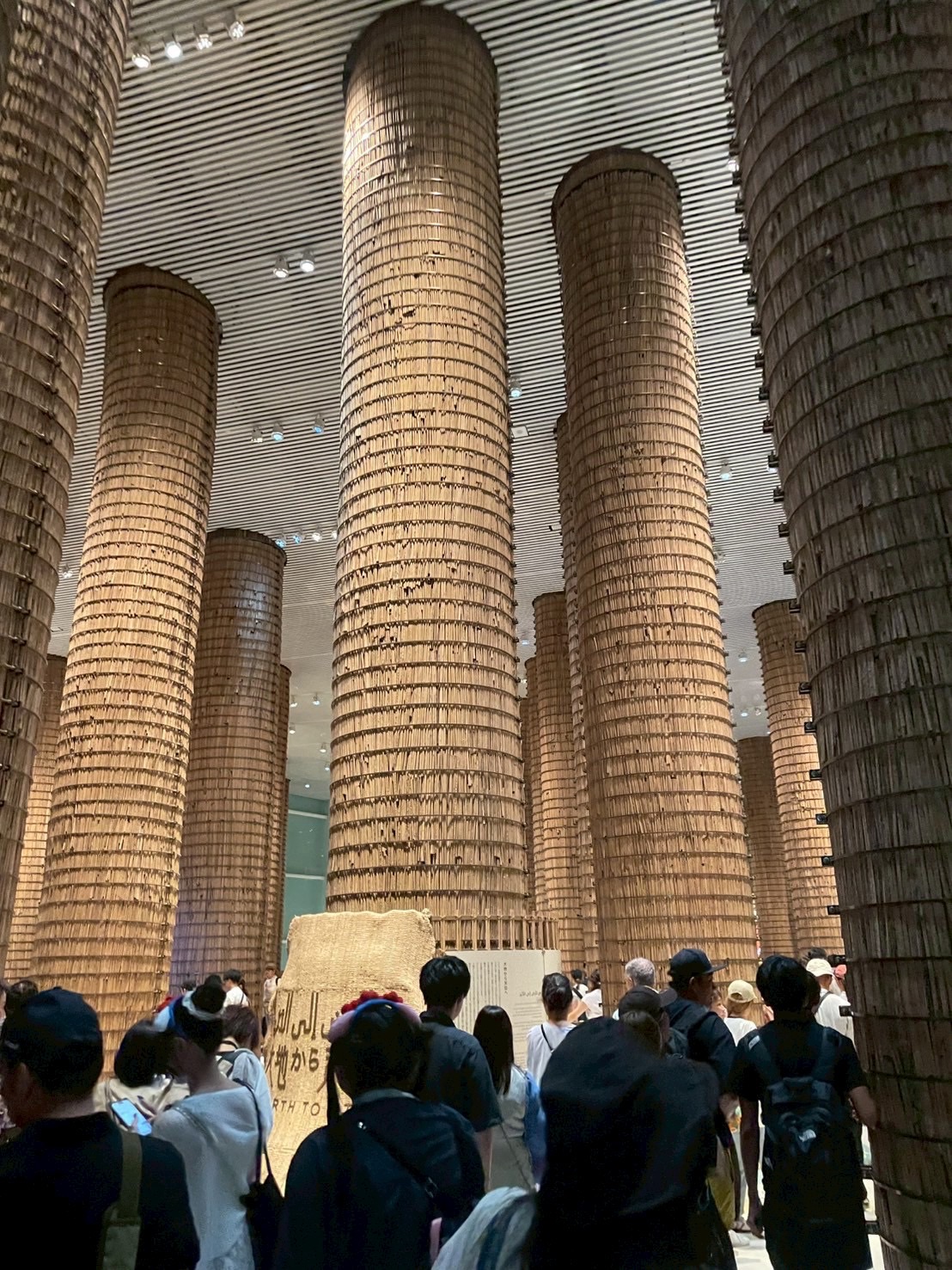内部には、高さ16メートルの巨大な柱が90本も並び、その迫力に圧倒されました。柱にはナツメヤシの素材が使われており、UAEの象徴を表しているとのこと。大地から空へとまっすぐ伸びる姿は、まるで砂漠の中にそびえ立つオアシスのようです。