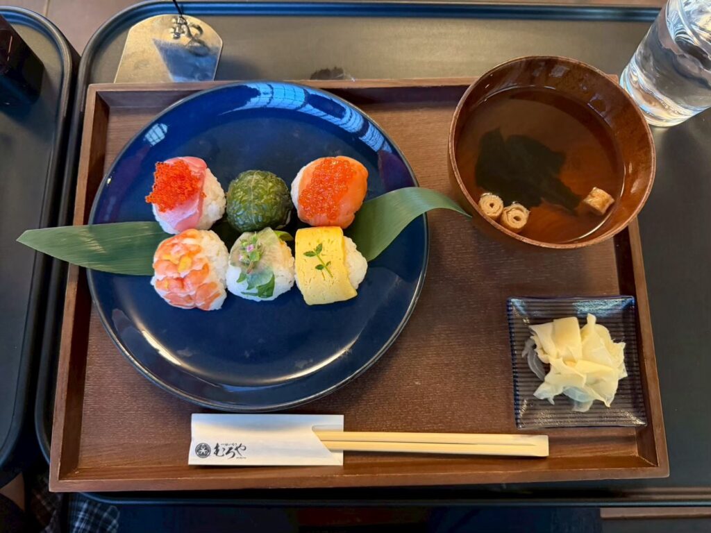 マグロ、サーモンいくら、たまご、海老、エゴマの葉、ガリの6種。
