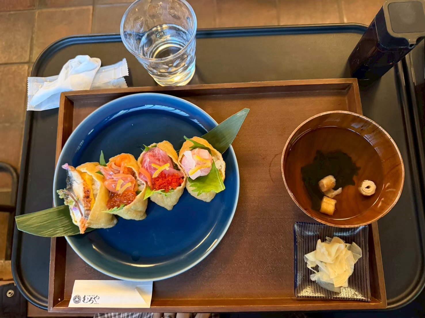 マグロ、サーモンいくら、たまご、海老、エゴマの葉、ガリの6種。