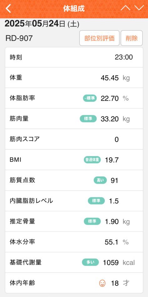 体重は 45.45kg、体脂肪率は 22.7%。