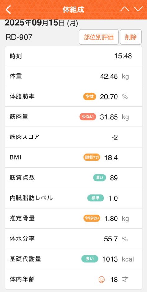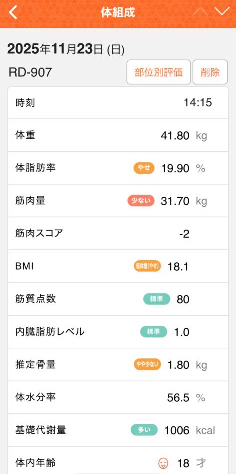 とはいえ筋肉量は31.70kgと「少ない」判定なので、ここからは引き締め期です。