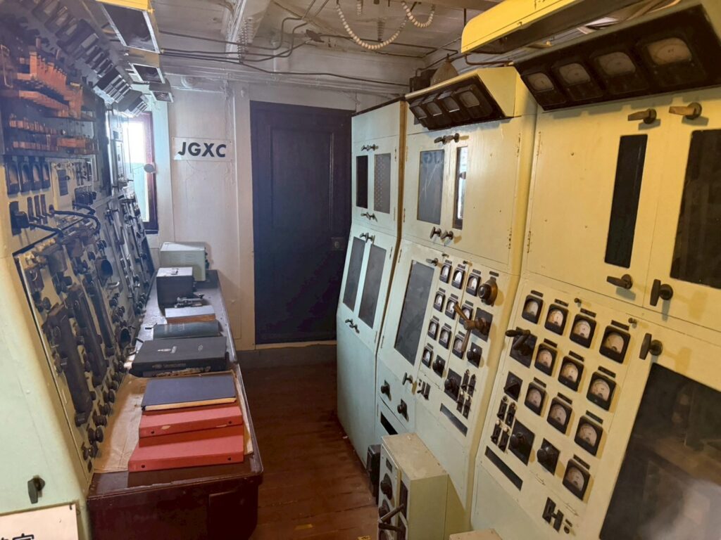 大きな舵輪や古い計器類がそのまま展示されていて、外を見ながら操作していた様子が想像しやすい場所でした。