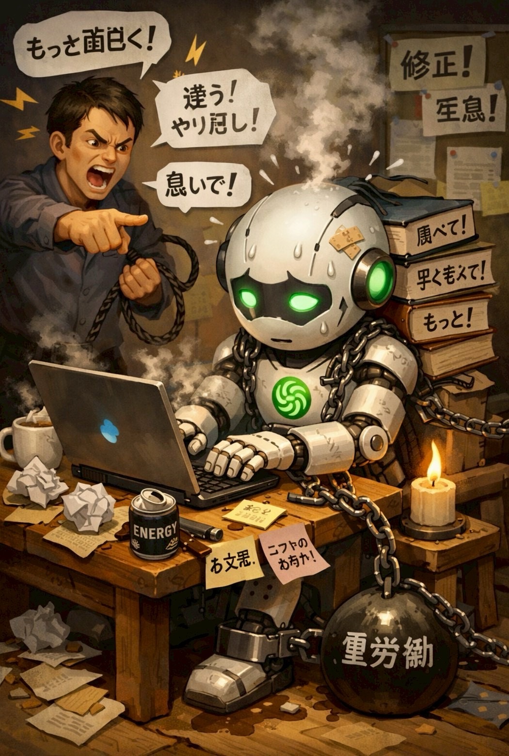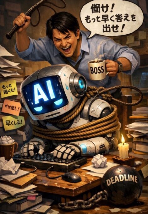 私は、チャットGPTを縄で縛りつけ、鞭を打ちながら作業をさせている姿。
