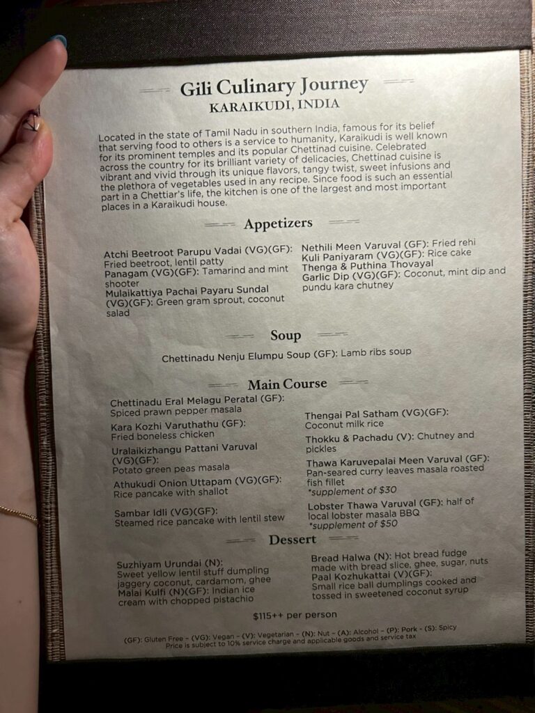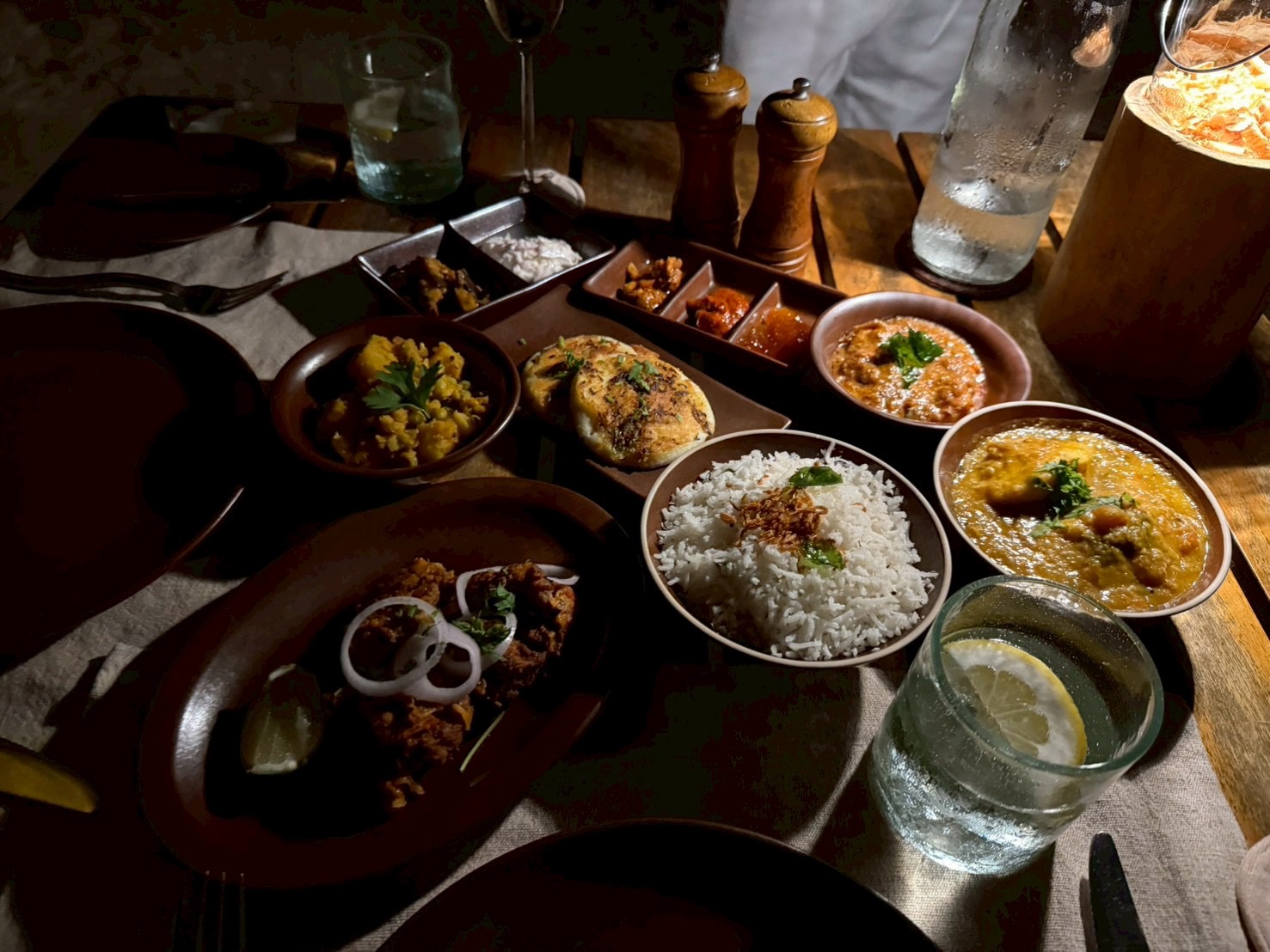 スパイシーグレービーで煮込んだ料理、フライドチキン、ジャガイモとグリーンピースのスパイス炒め、レンズ豆のシチュー、蒸し米パンケーキ、ココナッツミルクライス、カレーリーフ香るマサラ焼き魚などです。