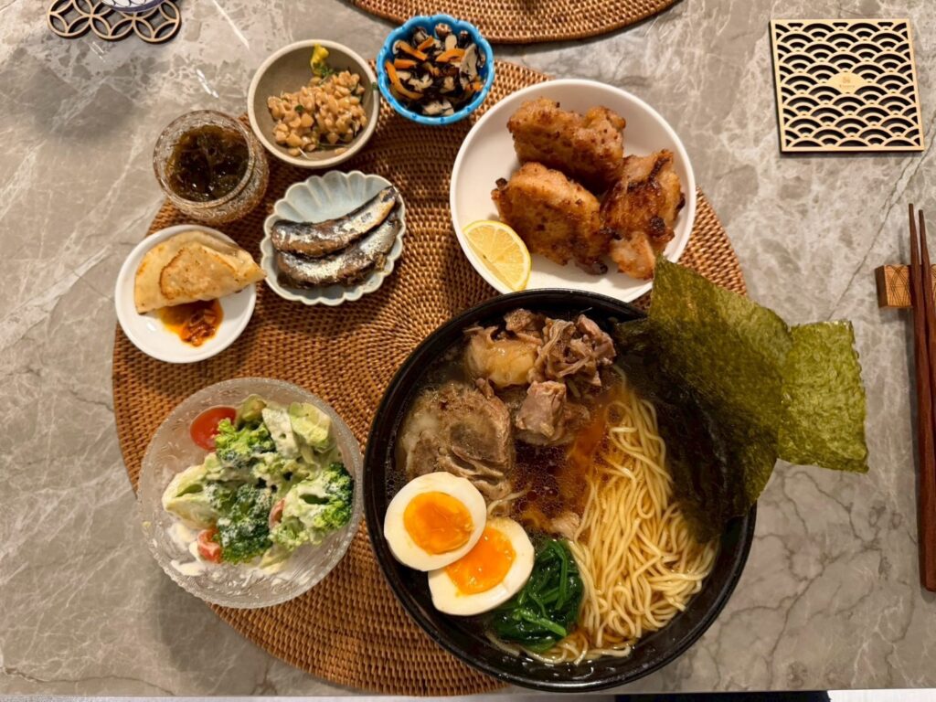 ラーメン・餃子・唐揚げという“最強トリオ”に、和の副菜もたっぷり添えた贅沢プレートです。