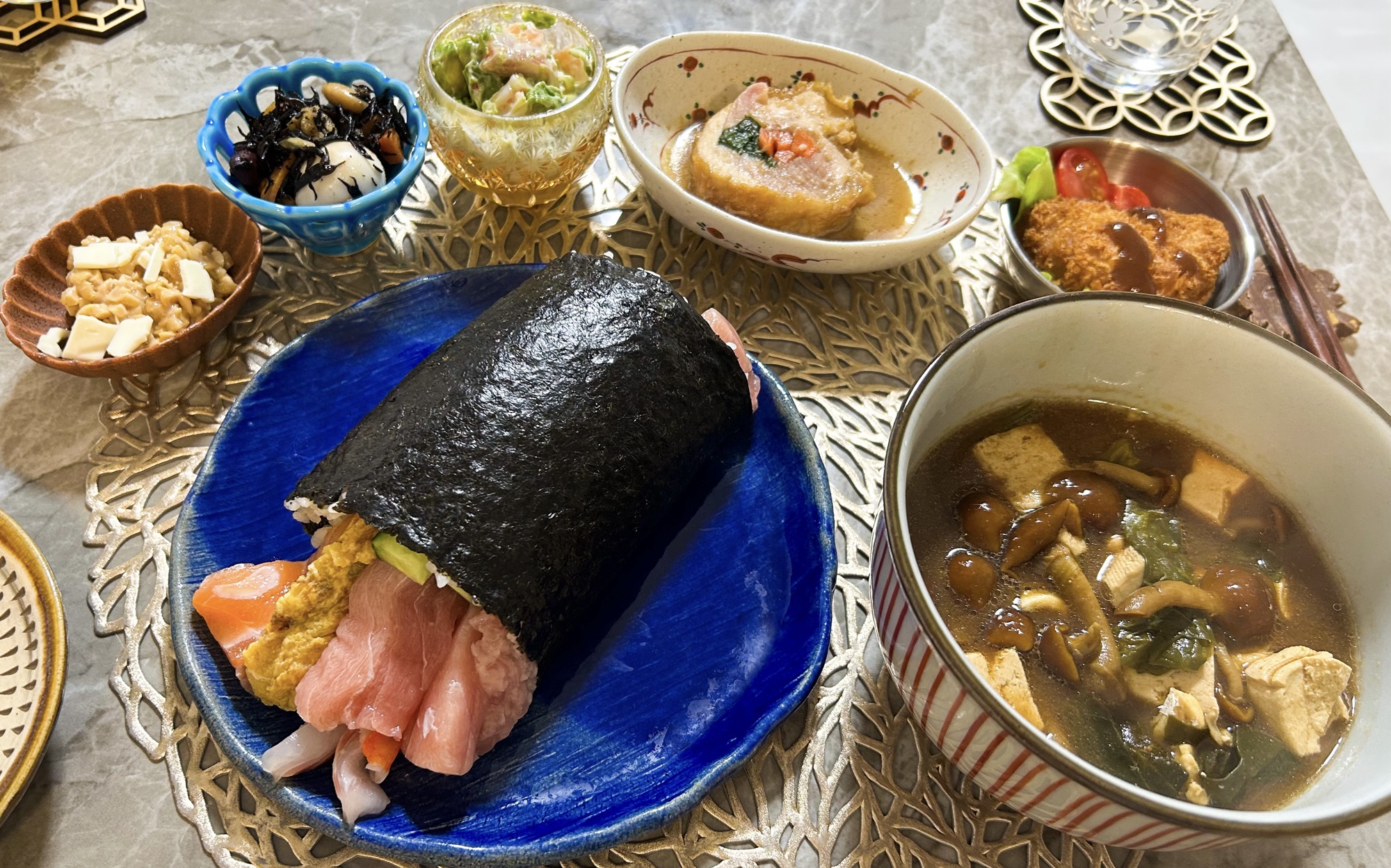 一口ごとに違う味わいが広がり、最後まで飽きずに楽しめる恵方巻きでした。