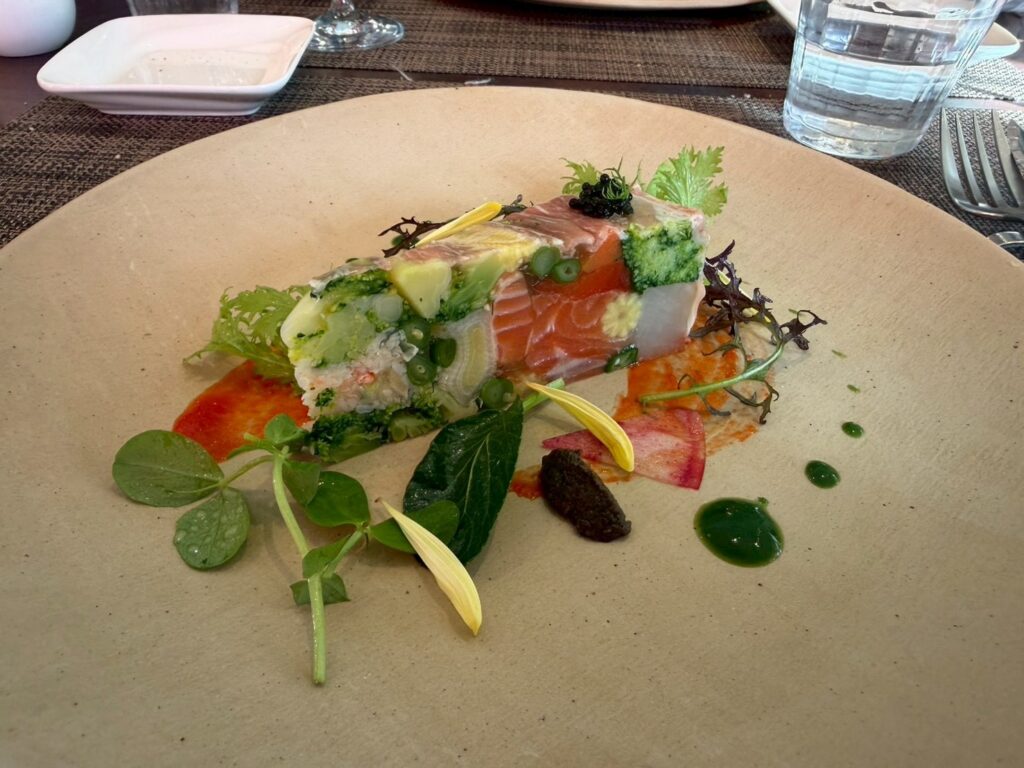 ・スペシャリテ 信州サーモンと北海ズワイガニ、彩り野菜を生ハムで包んだケーキ仕立て